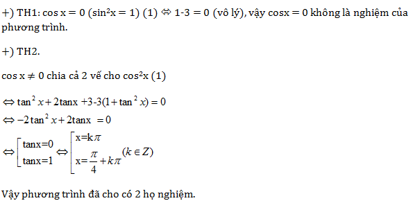 Giải phương trình: \({\sin ^2}x + 2{\mathop{\rm s}\nolimits} {\rm{inx}}{\rm{.cosx + 3co}}{{\rm{s}}^2}x - 3 = 0\,\,\,(1)\)