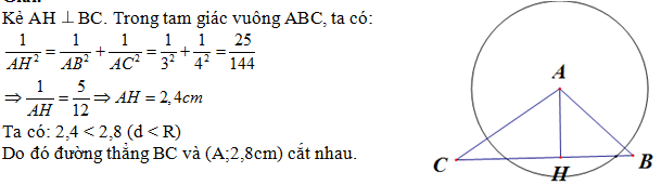 Cho tam giác ABC vuông tại A có AB = 3cm, AC = 4cm. Vẽ đường tròn tâm A bán kính 2,8cm. Hãy xác định vị trí tương đối của đường thẳng BC và đường tròn (A;2,8cm).