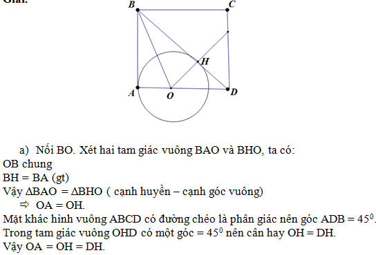 Cho hình vuông ABCD. Trên đường chéo BD lấy BH = BA (H nằm giữa hai điểm B và D). Qua H kẻ đường thẳng vuông góc với BD và đường thẳng này cắt AD tại O.