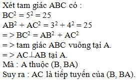 Cho tam giác ABC có AB = 3, AC = 4, BC = 5. Vẽ đường tròn (B, BA). Chứng minh rằng AC là tiếp tuyến