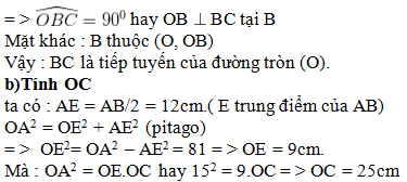 b) Cho bán kính đường tròn bằng 15cm, AB = 24cm. tính OC.