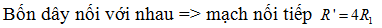 Một dây dẫn có chiều dài l và điện trở R. Nếu nối 4 dây dẫn trên với nhau thì dây mới có điện trở R’ là :
