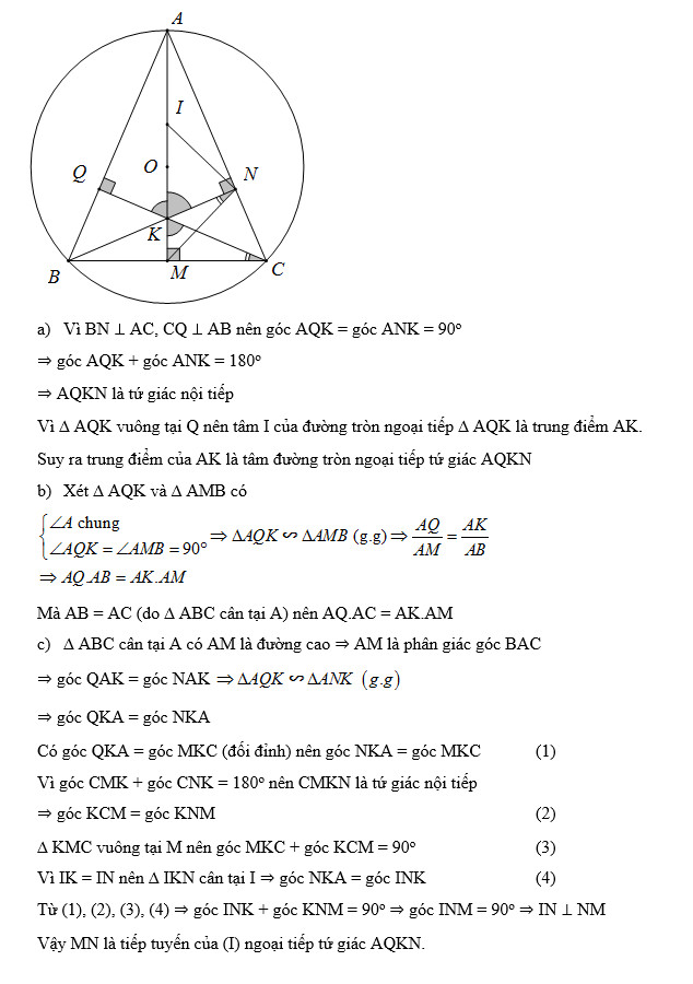 a) Chứng minh tứ giác AQKN nội tiếp đường tròn. Xác định tâm I của đường tròn ngoại tiếp tứ giác AQKN