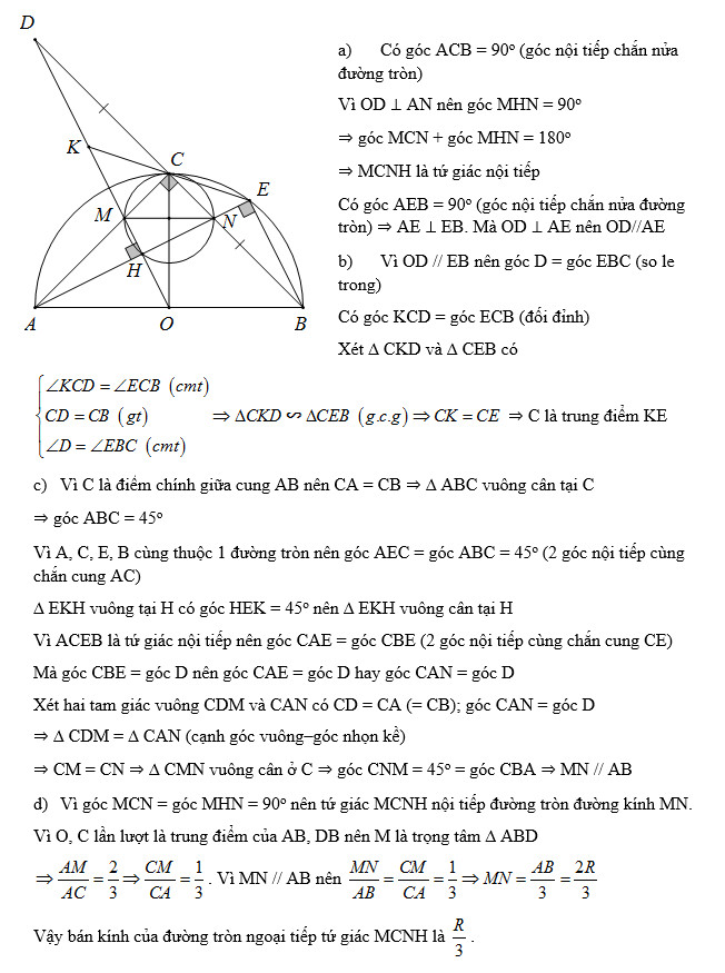 Cho nửa đường tròn (O;R) đường kính AB. Gọi C là điểm chính giữa cung AB. Trên tia đối của tia CB lấy điểm D sao cho CD = CB; OD cắt AC tại M. Từ A, kẻ AH vuông góc với OD (H ∈ OD), AH cắt DB tại N và cắt nửa đường tròn (O;R) tại E