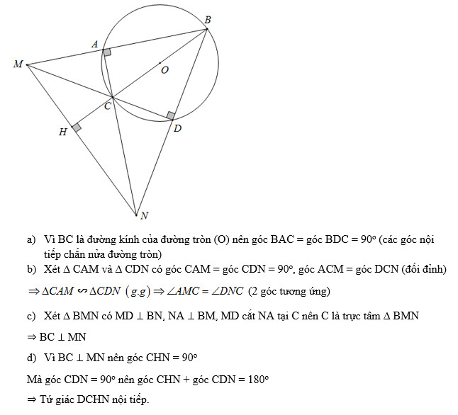 d) Gọi H là giao điểm giữa BC và MN. Chứng minh tứ giác DCHN nội tiếp.