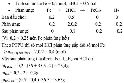 Nếu cho 11,2g Fe tác dụng với 18,25g HCl thì sau phản ứng sẽ được những chất nào ? Bao nhiêu gam?