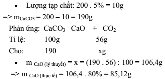 Nung 200g đá vôi có lẫn 5% tạp chất được vôi sống CaO và khí CO2 . Tính khối lượng vôi sống thu được nếu hiệu suất phản ứng đạt 80%.