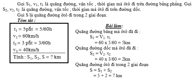 Một ôtô đi 5 phút trên con đường bằng phẳng với vận tốc 60km/h, sau đó lên dốc 3 phút với vận tốc 40km/h. Coi ôtô chuyển động đều. Tính quãng đường ôtô đã đi trong 2 giai đoạn.