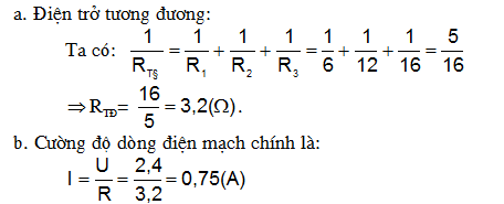 Có 3 điện trở là R1 = 6Ω, R2 = 12 Ω và R3 = 16 Ω được mắc song song với nhau vào hiệu điện thế U = 2,4 V.