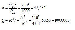 Một ấm điện có ghi 220V – 1000W. Tính nhiệt lượng tỏa ra của ấm khi sử dụng ấm liên tục trong một giờ ở hiệu điện thế 110V