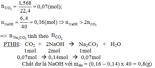 Dẫn từ từ 1,568 lít khí CO2 (đktc) tác vào một dung dịch có hòa tan 6,4g NaOH, sản phẩm là muối Na2CO3.