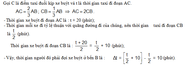 Một người đến bến xe buýt chậm 20 phút sau khi xe buýt đã rời bến A, người đó bèn đi taxi đuổi theo để kịp lên xe buýt ở bến B kế tiếp. Taxi đuổi kịp xe buýt khi nó đã đi được 2/3 quãng đường từ A đến B. Hỏi người này phải đợi xe buýt ở bến B bao lâu ? Coi chuyển động của các xe là chuyển động đều