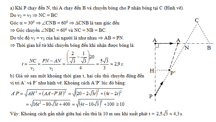 Trong một buổi tập chuẩn bị cho EURO 2012 của đội tuyển Nga, hai cầu thủ Arshavin và Pavlyuchenko (gọi tắt là A và P tương ứng) thực hiện một pha chuyền bóng như sau. A dẫn bóng theo một đường thẳng với tốc độ không đổi là v1. P chạy trên một đường thẳng khác với tốc độ không đổi v2. Vào thời điểm ban đầu, A và P cách nhau một khoảng L = 20 m và có vị trí như trên hình 1, với góc a = 300. Khi P chạy qua điểm N thì A chuyền bóng cho P. Coi bóng chuyển động thẳng với tốc độ không đổi v3. Cho v1 = v2 = v3= 4 m/s.
