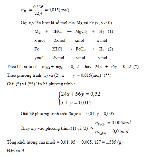 Cho 0,52 gam hỗn hợp hai kim loại Mg và Fe tan hoàn toàn trong dd HCl, dư thấy thoát ra 0,336 lít khí