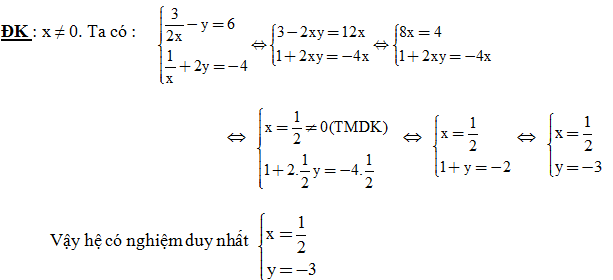 Giải hệ phương trình: \(\left\{ \begin{array}{l}\frac{3}{{2x}} - y = 6\\\frac{1}{x} + 2y = - 4\end{array} \right..\)