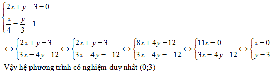 Giải hệ phương trình: \(\left\{ \begin{array}{l}2x + y - 3=0\\\frac{x}{4} = \frac{y}{3} - 1\end{array} \right..\)