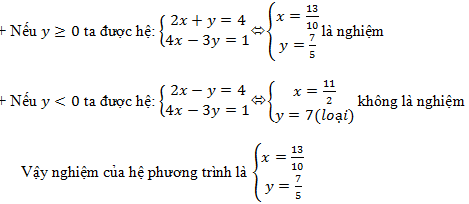 Giải hệ phương trình: \(\left\{ \begin{array}{l}2x + \left| y \right| = 4\\4x - 3y = 1\end{array} \right..\)
