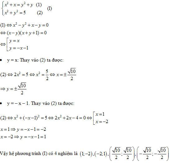 Giải hệ phương trình \(\left\{ \begin{array}{l}{x^2} + x = {y^2} + y\\{x^2} + {y^2} = 5\end{array}