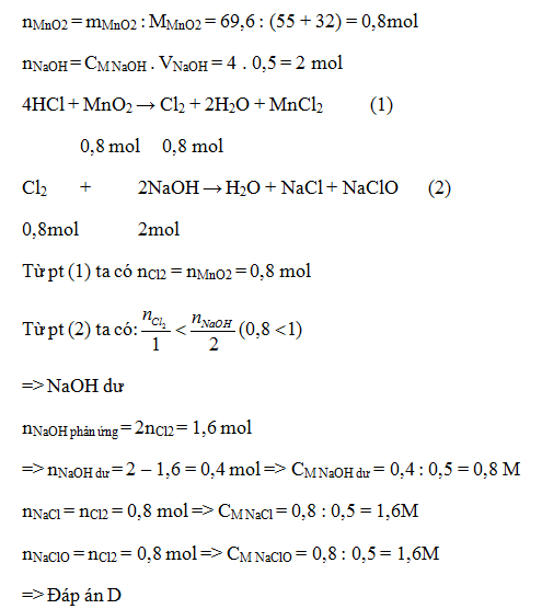 69,6 g mangan đioxit tác dụng với HCl đặc, dư. Dẫn toàn bộ lượng khí sinh ra vào 500 ml dung dịch NaOH 4M. Coi thể tích dung dịch thay đổi không đáng kể, nồng độ mol các chất trong dung dịch sau phản ứng là:
