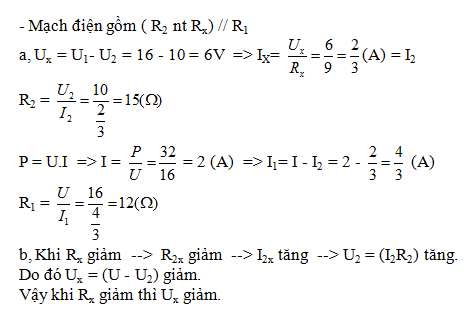 b) Khi điện trở của biến trở Rx giảm thì hiệu thế giữa hai đầu biến trở tăng hay giảm? Giải thích.