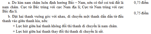 b. Có hai thanh thép giống hệt nhau, trong đó có một thanh bị nhiễm từ, làm thế nào để biết được thanh nào bị nhiễm từ? (không dùng thêm dụng cụ gì khác)