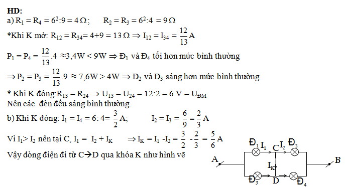 Cho mạch điện như hình vẽ 2, trong đó Đ1 và Đ4 là 2 bóng đèn loại 6V - 9W; Đ2 và Đ3 là 2 bóng đèn loại 6V - 4W. Hiệu điện thế giữa 2 điểmA, B là U = 12V.