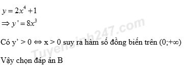 Hỏi hàm số y = 2x4 + 1 đồng biến trên khoảng nào?
