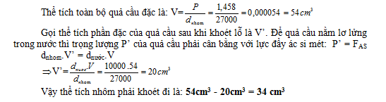 Một quả cầu đặc bằng nhôm, ở ngoài không khí có trọng lượng 1,458N. Hỏi phải khoét lõi
