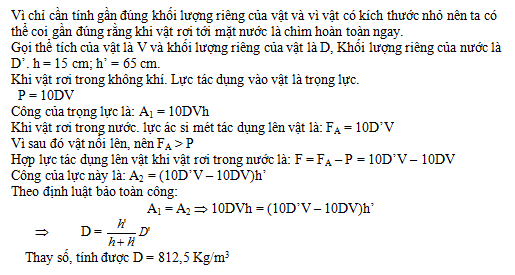 Một vật nặng bằng gỗ, kích thước nhỏ, hình trụ, hai đầu hình nón được thả không có vận tốc ban đầu từ độ cao 15 cm xuống nước. Vật tiếp tục rơi trong nước, tới độ sâu 65 cm thì dừng lại, rồi từ từ nổi lên. Xác định gần đúng khối lượng riêng của vật. Coi rằng chỉ có lực ác si mét là lực cản đáng kể mà thôi. Biết khối lượng riêng của nước là 1000 kg/m3.