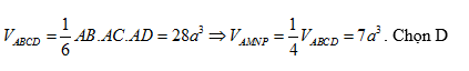 Cho tứ diện ABCD có các cạnh AB, AC và AD đôi một vuông góc với nhau; AB = 6a, AC =7a và AD = 4a. Gọi M, N, P tương ứng là trung điểm các cạnh BC, CD, DB. Tính thể tích V của tứ diện AMNP