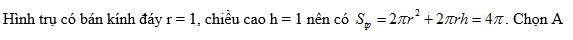 Trong không gian, cho hình chữ nhật ABCD có AB = 1 và AD = 2. Gọi M, N lần lượt là trung điểm của AD và BC. Quay hình chữ nhật đó xung quanh trục MN, ta được một hình trụ. Tính diện tích toàn phần Stp của hình trụ đó.