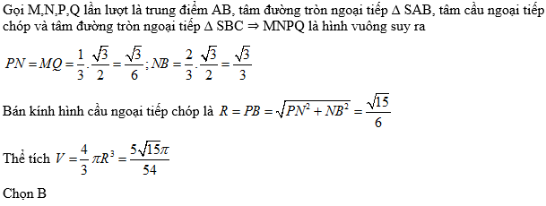 Cho hình chóp S.ABC có đáy ABC là tam giác đều cạnh bằng 1, mặt bên SAB là tam giác đều và nằm trong mặt phẳng vuông góc với mặt phẳng đáy. Tính thể tích V của khối cầu ngoại tiếp hình chóp đã cho