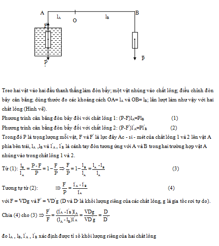 Xác định tỉ số các khối lượng riêng của hai chất lỏng cho trước nhờ các dụng cụ và vật liệu sau đây: hai bình chứa các chất lỏng khác nhau, một thanh thẳng làm đòn bẩy, hai quả nặng có khối lượng bằng nhau, giá đỡ có khớp nối để làm điểm tựa cho đòn bẩy, thước thẳng.