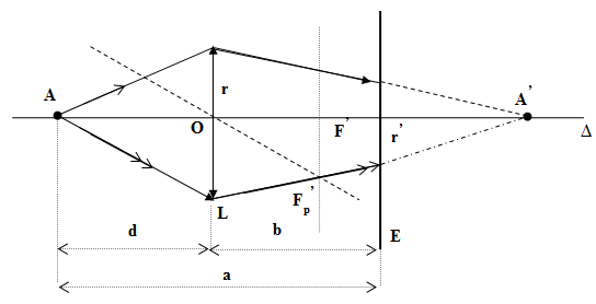 b) Một điểm sáng A và màn ảnh (E) được đặt cách nhau một khoảng cố định a = 100cm.Đặt một thấu kính hội tụ (L) có rìa hình tròn, nằm trong khoảng giữa A và màn (E) sao cho trục chính của thấu kính vuông góc với màn, A nằm trên trục chính (Hình 2). Tịnh tiến thấu kính dọc theo trục chính trong khoảng giữa A và màn (E) người ta thấy trên màn thu được một vệt sáng, vệt sáng này không bao giờ thu lại thành một điểm. Khi thấu kính cách màn một đoạn b = 40cm thì vệt sáng trên màn có bán kính nhỏ nhất. Tính tiêu cự của thấu kính.