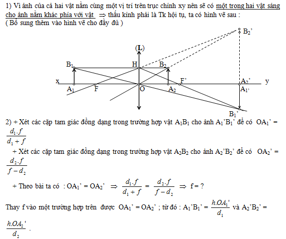 xy ) và ở hai bên của một thấu kính (L). Ảnh của hai vật tạo bởi thấu kính ở cùng một vị trí trên xy . Biết OA1 = d1 ; OA2 = d2 :