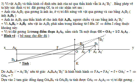 3) Bỏ A1B1 đi, đặt một gương phẳng vuông góc với trục chính tại I ( I nằm cùng phía với A2B2 và OI > OA2 ), gương quay mặt phản xạ về phía thấu kính. Xác định vị trí của I để ảnh của A2B2 qua Tk và qua hệ gương - Tk cao bằng nhau ?