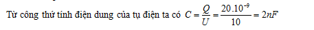 Đặt vào hai đầu tụ một hiệu điện thế 10 V thì tụ tích được một điện lượng 20.10-9 C. Điện dung của tụ là