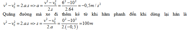 Một đoàn tàu đang đi với tốc độ 10m/s thì hãm phanh, chuyển động thẳng chậm dần đều. Sau khi đi thêm được 64m thì tốc độ của nó chỉ còn 21,6km/h. Gia tốc của đoàn tàu và quãng đường mà đoàn tàu đi thêm được kể từ lúc hãm phanh đến lúc dừng lại là?