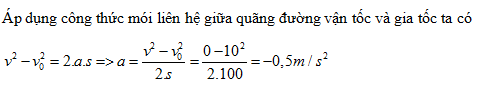 Khi ôtô đang chạy với vận tốc 10 m/s trên đoạn đường thẳng thì người lái xe hãm phanh và ôtô chuyển động chậm dần đều cho tới khi dừng hẳn lại thì ôtô đã chạy thêm được 100 m. Gia tốc a của ôtô là bao nhiêu?