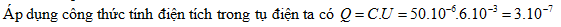 Một tụ điện có điện dung 50 µF, được tích điện dưới hiệu điện thế 6 mV. Điện tích