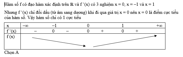 Cho hàm số f có đạo hàm là f ‘(x) = x(x +1)2(x – 1)4, số điểm cực tiểu của hàm số f