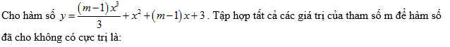 Hàm số không có cực trị ⇔ Phương trình y’ = (m – 1)x2 + 2x + m – 1 = 0 vô nghiệm