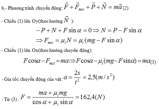 b) Nếu vật được kéo trượt trên một mặt sàn nằm ngang bởi một lực hợp với phương ngang 1 góc 30. Tính lực để sau khi chuyển động được 2 s vật đi được quãng đường 5 m.
