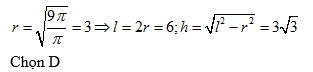 Một hình nón tròn xoay có đường sinh bằng đường kính đáy. Diện tích đáy của hình nón bằng 9π. Khi đó chiều cao h của hình nón bằng: