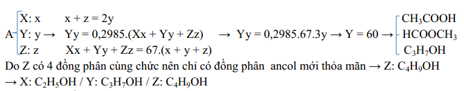 2. Ba chất hữu cơ X, Y, Z có thành phần chứa C, H, O và kế tiếp nhau trong dãy đồng đẳng. A là hỗn hợp của ba chất trên, khối lượng mol phân tử trung bình của A là 67. Trong A, Y chiếm 29,85% về khối lượng, số mol của Y là trung bình cộng của X và Z. Xác định công thức phân tử và công thức cấu tạo của ba chất trên, biết rằng Z có bốn đồng phân cùng chức.