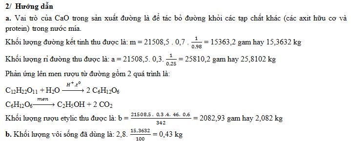 2/ Trong quá trình chế biến nước mía để được đường kết tinh (chứa 2% tạp chất) và rỉ đường (chứa 25% đường nguyên chất) người ta phải dùng vôi sống CaO. Từ 260 lít nước mía có nồng độ đường 7,5% (có khối lượng riêng 1,103 gam/ml) chế biến được m (kg) đường kết tinh , a (kg) rỉ đường. Toàn bộ lượng rỉ đường thu được đem lên men thành b (kg) rượu etylic với hiệu suất 60%. Biết chỉ 70% lượng đường thu được ở dạng kết tinh, phần còn lại nằm trong rỉ đường.