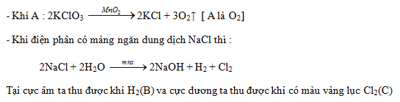 2) Cho 3 chất khí A, B, C. Khí A tạo ra khi nung nóng KClO3 có xúc tác MnO2 . Khí B sinh ra ở cực âm và khí C(có màu vàng lục) sinh ra ở cực dương khi điện phân dung dịch NaCl có màng ngăn. Hãy cho biết A, B, C là những khí gì? Viết phương trình phản ứng.