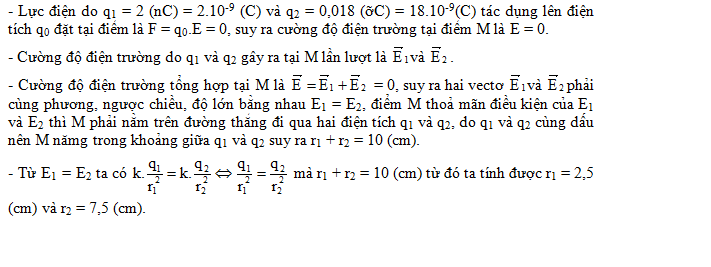 Cho hai điện tích dương q1 = 2 (nC) và q2 = 0,018 (µC) đặt cố định và cách nhau 10 (cm). Đặt thêm