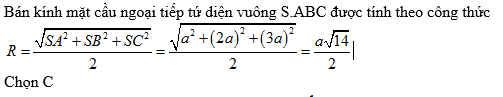 Ba đoạn thẳng SA,SB,SC đôi một vuông góc tạo với nhau thành một tứ diện SABC với SA = a, SB= 2a ,SC =3a.Tính bán kính mặt cầu ngoại tiếp hình tứ diện đó là