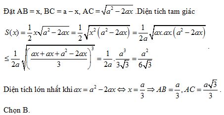 Hãy tìm độ dài các cạnh góc vuông của tam giác vuông có diện tích lớn nhất nếu tổng của một cạnh góc vuông và cạnh huyền bằng hằng số a (a>0) trong các phương án sau: